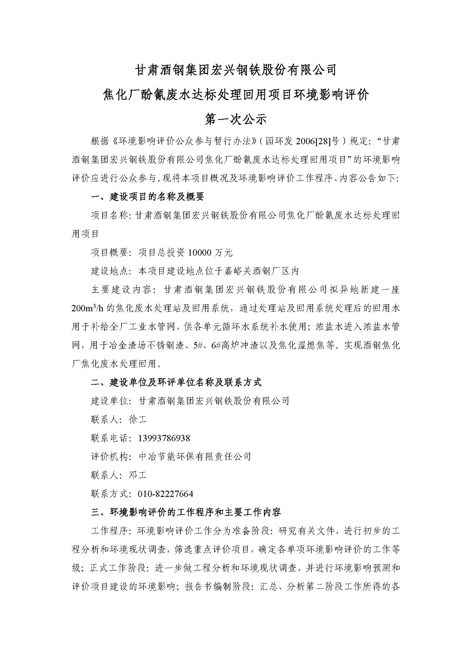 甘肅酒鋼集團(tuán)宏興鋼鐵股份有限公司焦化廠酚氰廢水達(dá)標(biāo)處理回用項目環(huán)境影響評價第一次公