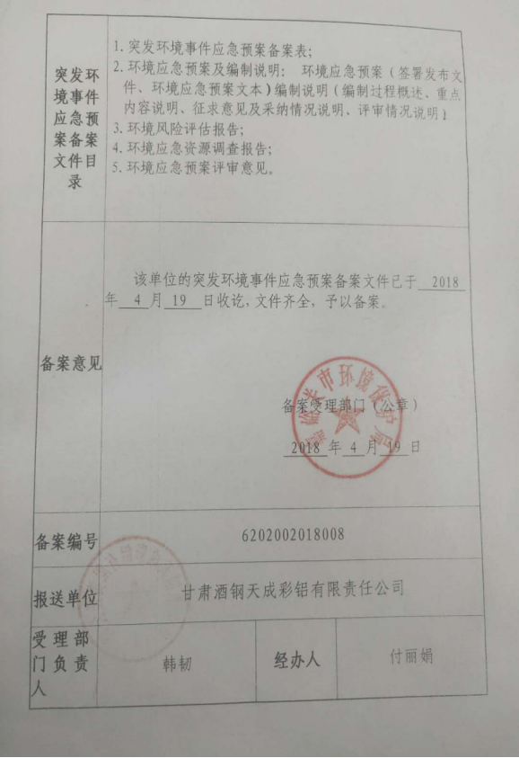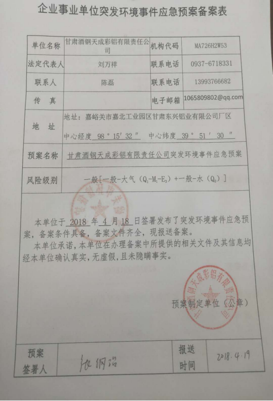 1. 應急預案名稱:甘肅酒鋼天成彩鋁有限責任公司突發