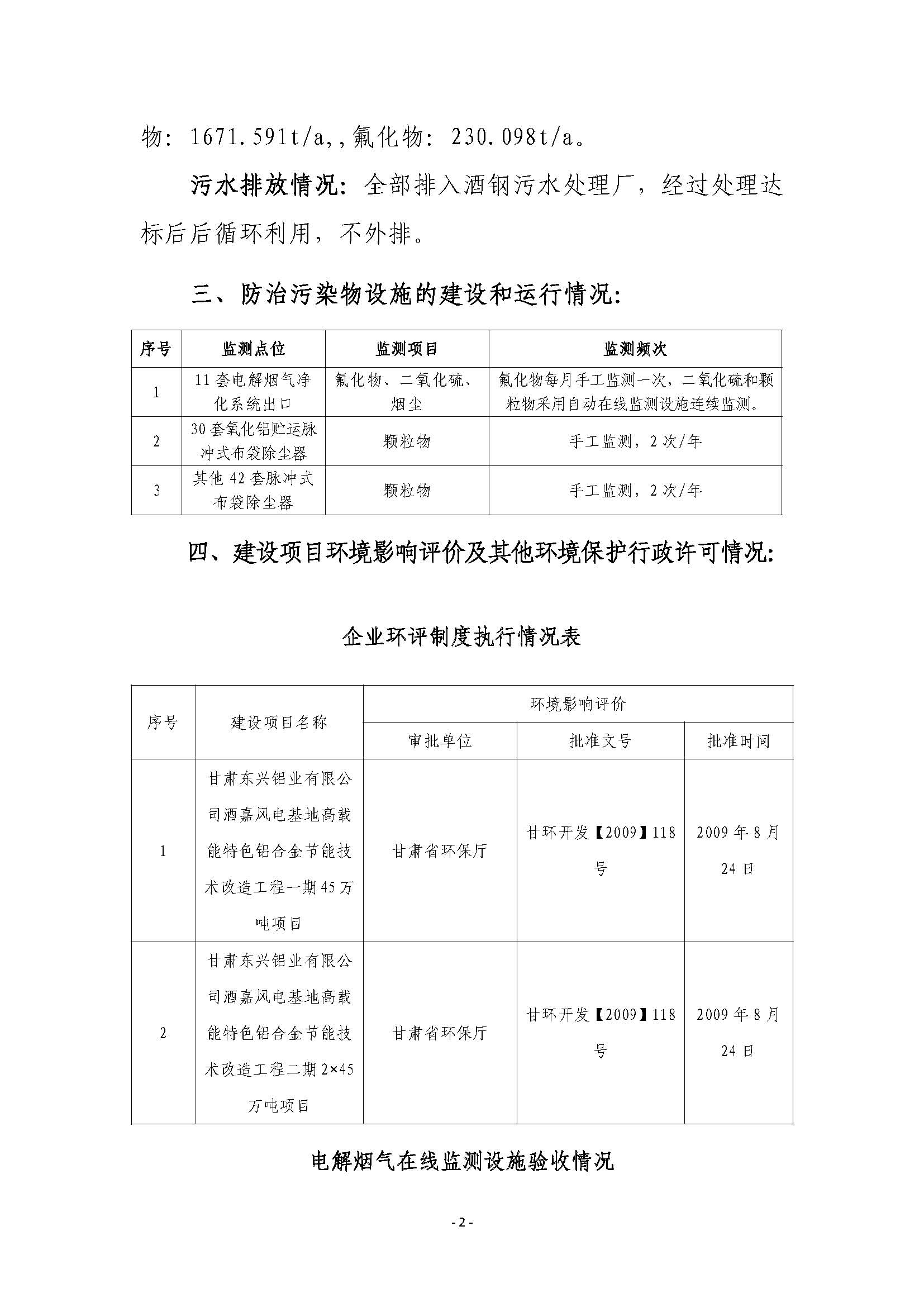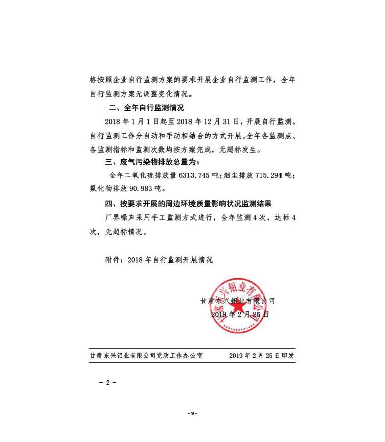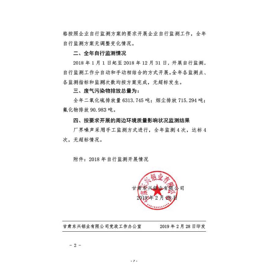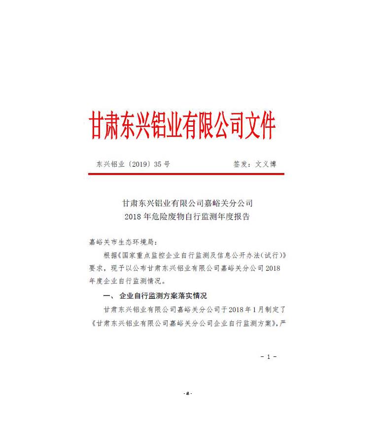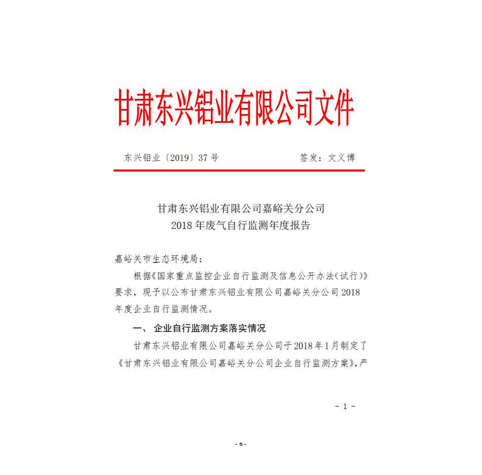 甘肅東興鋁業有限公司嘉峪關分公司2019年度環境信息公開