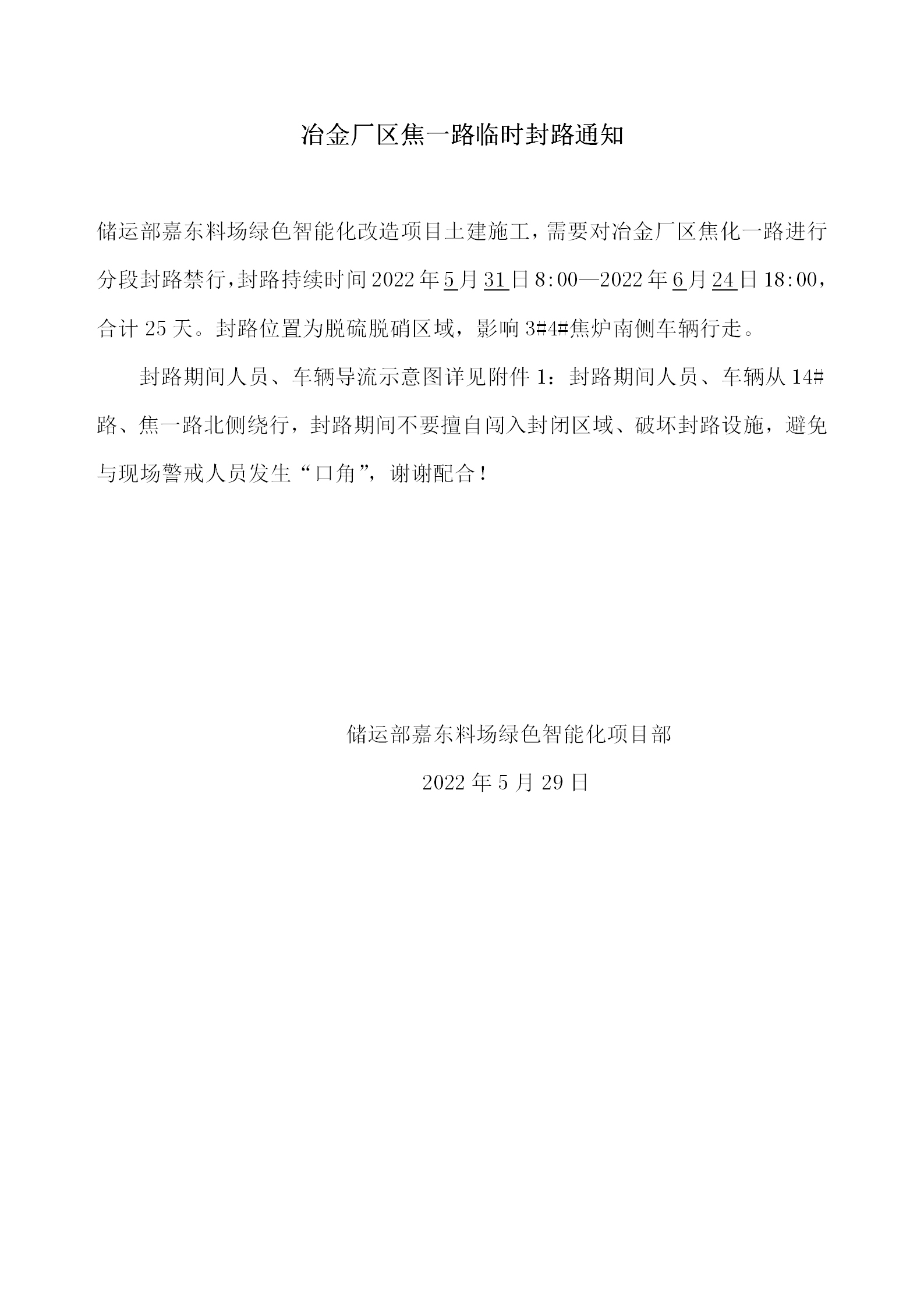 冶金廠區(qū)焦一路臨時(shí)封路通知