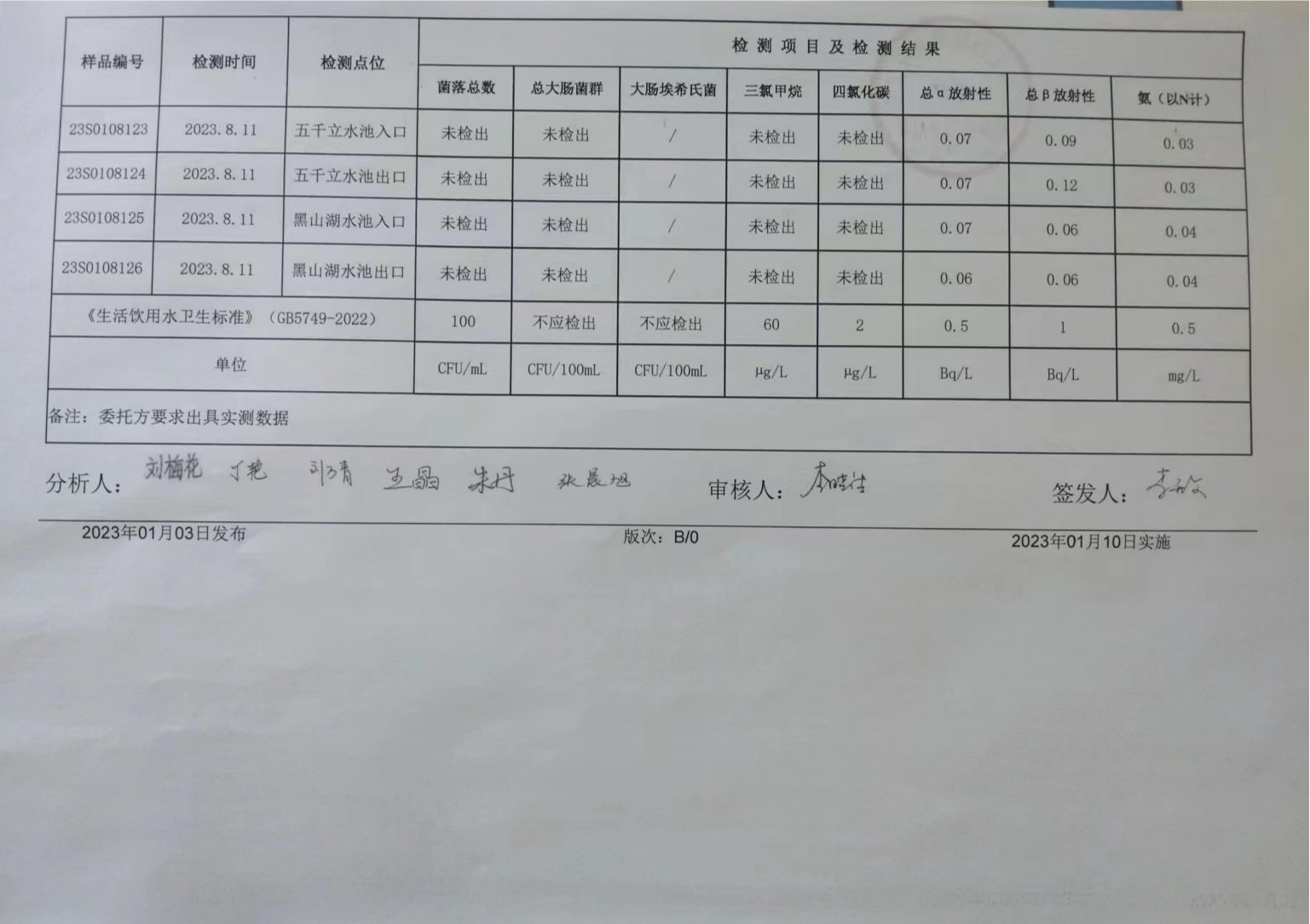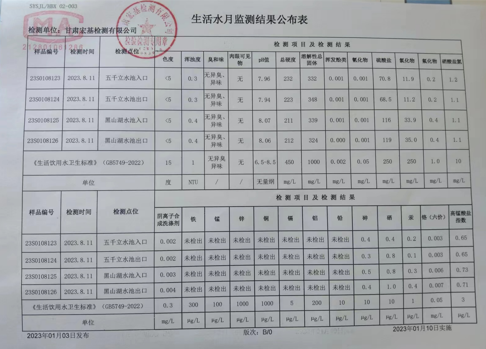 甘肅潤源環境資源科技有限公司水源地水質2023年第三季度公示
